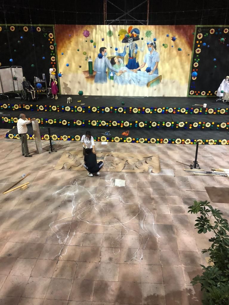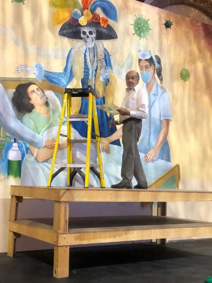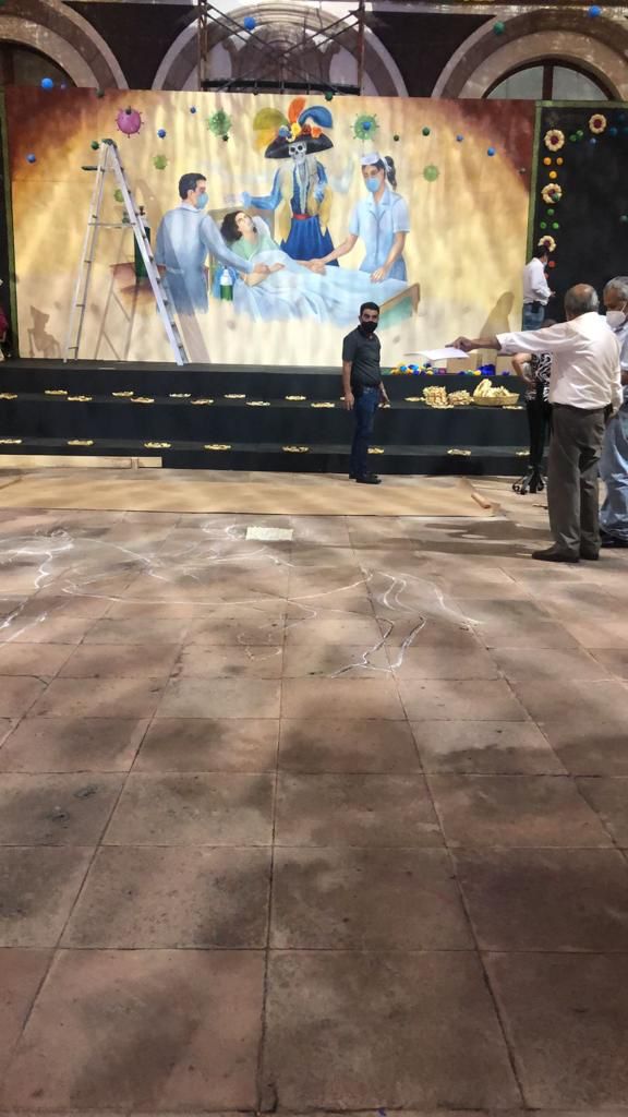 Al centro, se colocó una pintura realizada por un el artista plástico Edgardo Regil, donde se puede apreciar a una enferma postrada sobre una cama, custodiada por un médico y una enfermera, acompañados por la muerte vestida de catrina, con un brazo rozando su cabeza, mientras otros dos brazos transparentes intentan abrazar, al mismo tiempo, al personal médico.
