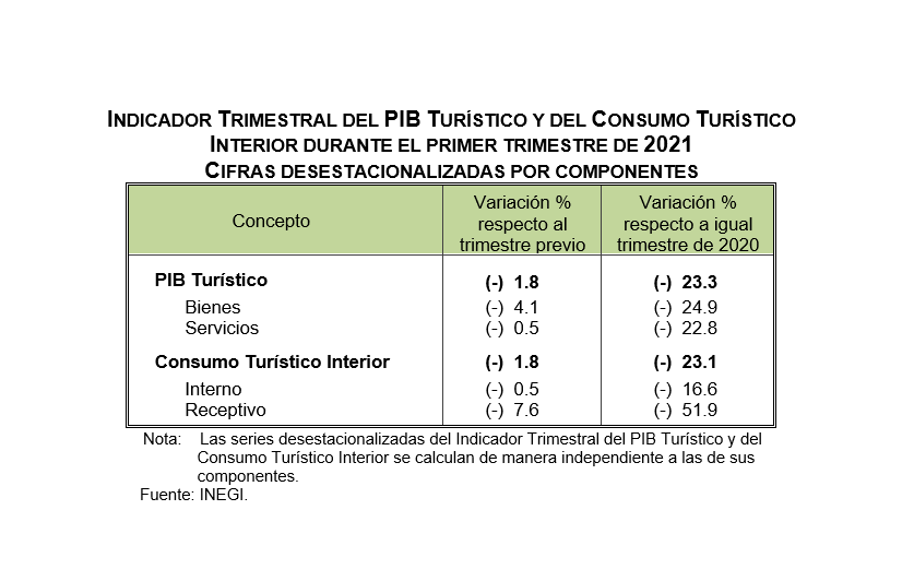 En el primer trimestre del año en curso, el Indicador Trimestral del PIB Turístico y el del Consumo Turístico Interior registraron una disminución de 1.8% en términos reales, en lo individual, frente al trimestre inmediato anterior con cifras desestacionalizadas.