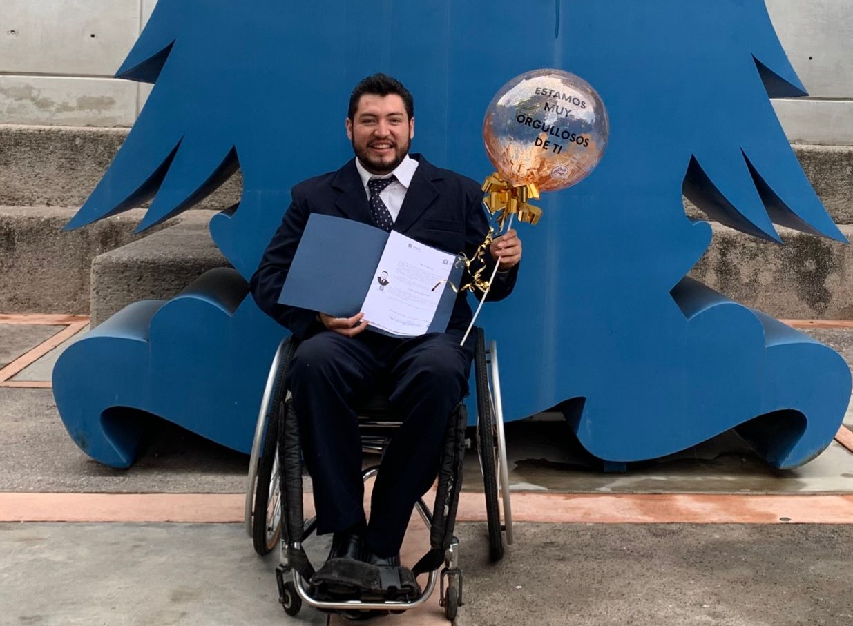 Gabriel Brondo Cano explicó que su discapacidad fue adquirida, “hace 3 años, y a mitad de la carrera, sufrí un accidente automovilístico en el cual se lesionó mi columna y debido a ello, perdí la capacidad motora de mis extremidades inferiores. Mucha gente puede pensar que con una discapacidad se cierran las puertas, que no se puede seguir adelante, pero definitivamente los límites los ponemos nosotros”.