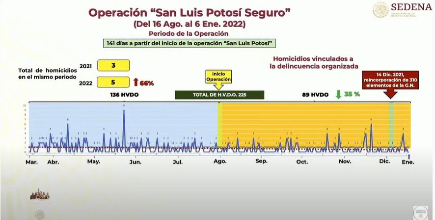 La operación “San Luis Potosí Seguro” que abarcó del 16 de agosto del 2021 al 6 de enero del 2022, refleja una disminución del 35 por ciento en homicidios vinculados a la delincuencia organizada, además de reportar que a partir del 14 de diciembre del año pasado fueron incorporados 310 efectivos de la Guardia Nacional, situación que ocurrió luego de la solicitud hecha por el Gobernador Gallardo Cardona al Mandatario nacional.