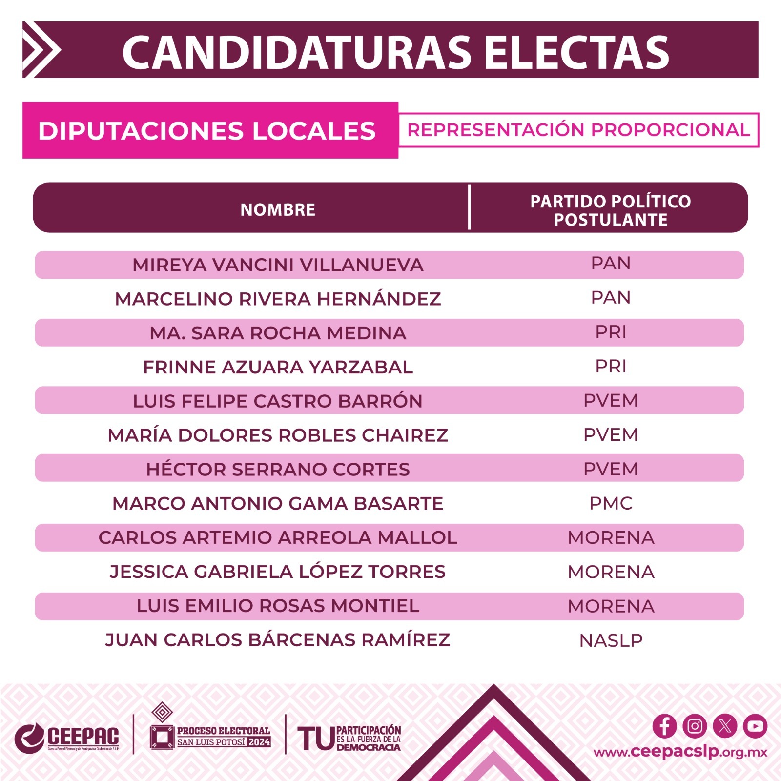 El Consejo Estatal Electoral y de Participación Ciudadana, determinó que las y los ciudadanos electos como integrantes de la LXIV Legislatura, cumplieron cabalmente con lo previsto en la Constitución Política del Estado Libre y Soberano de San Luis Potosí, motivo por el que una vez que rindan la Protesta de Ley a que refiere el artículo 50 de la Carta Magna del Estado, a partir del 14 de septiembre se desempeñarán como Diputadas y Diputados en el Periodo Constitucional 2024-2027.