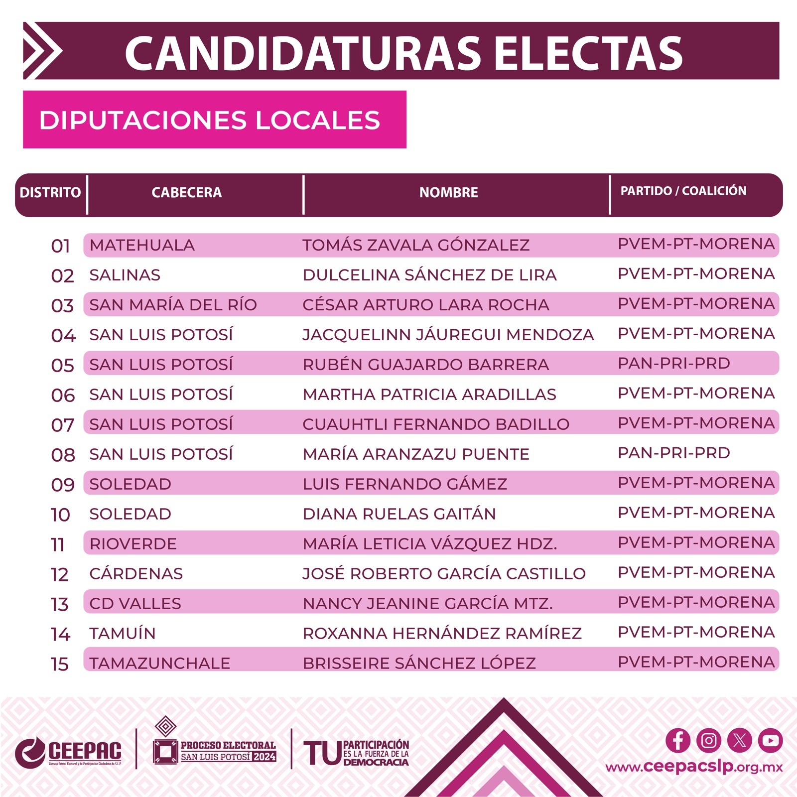 El Consejo General del Consejo Estatal Electoral y de Participación Ciudadana (CEEPAC) pronunció este día la Declaración de Validez de la elección de Diputaciones por el Principio de Mayoría Relativa, así como la asignación de Diputaciones por el principio de Representación Proporcional correspondiente a los 15 Distritos Electorales del estado de San Luis Potosí, que integrarán la LXIV Legislatura del H. Congreso del Estado de San Luis Potosí, en el periodo comprendido del 14 de septiembre del año 2024 al 13 de septiembre del año 2027.