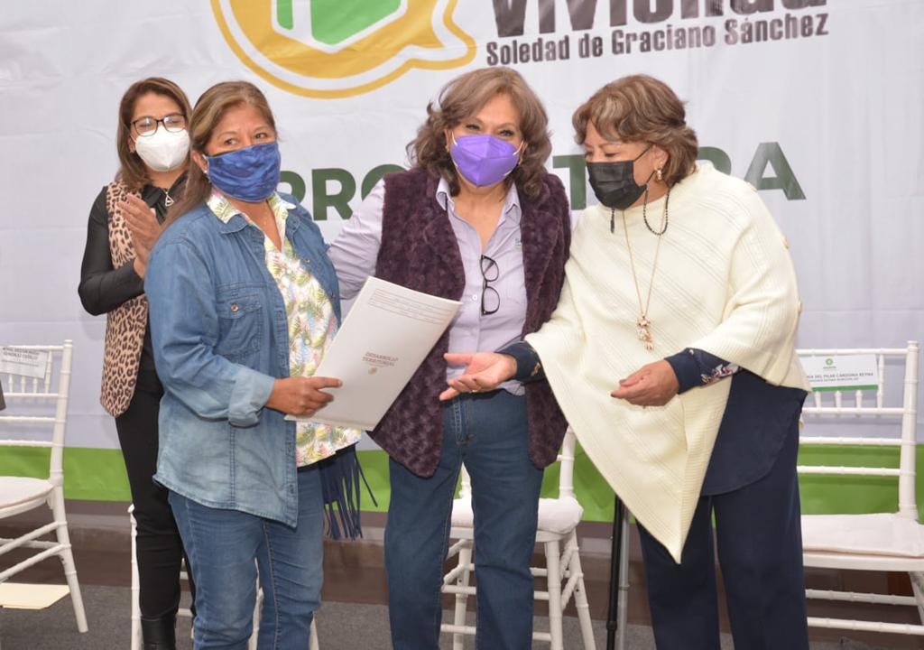 Soledad de Graciano Sánchez; SLP.- Con el objetivo de mejorar la calidad de vida de habitantes del municipio de Soledad de Graciano Sánchez; este viernes se hizo entrega de 85 escrituras a familias que habitan la localidad y que se encuentran en condición vulnerable; la cesión de estos documentos de propiedad se realizó a través del Instituto Municipal de la Vivienda.