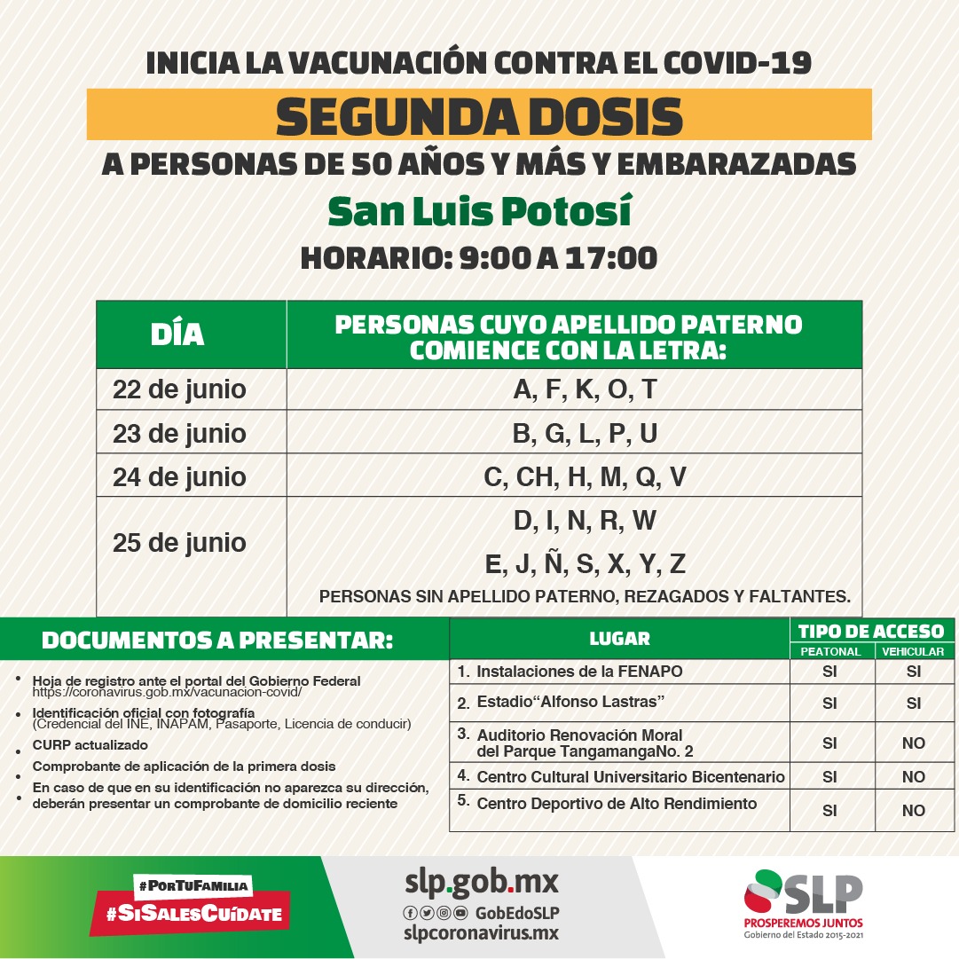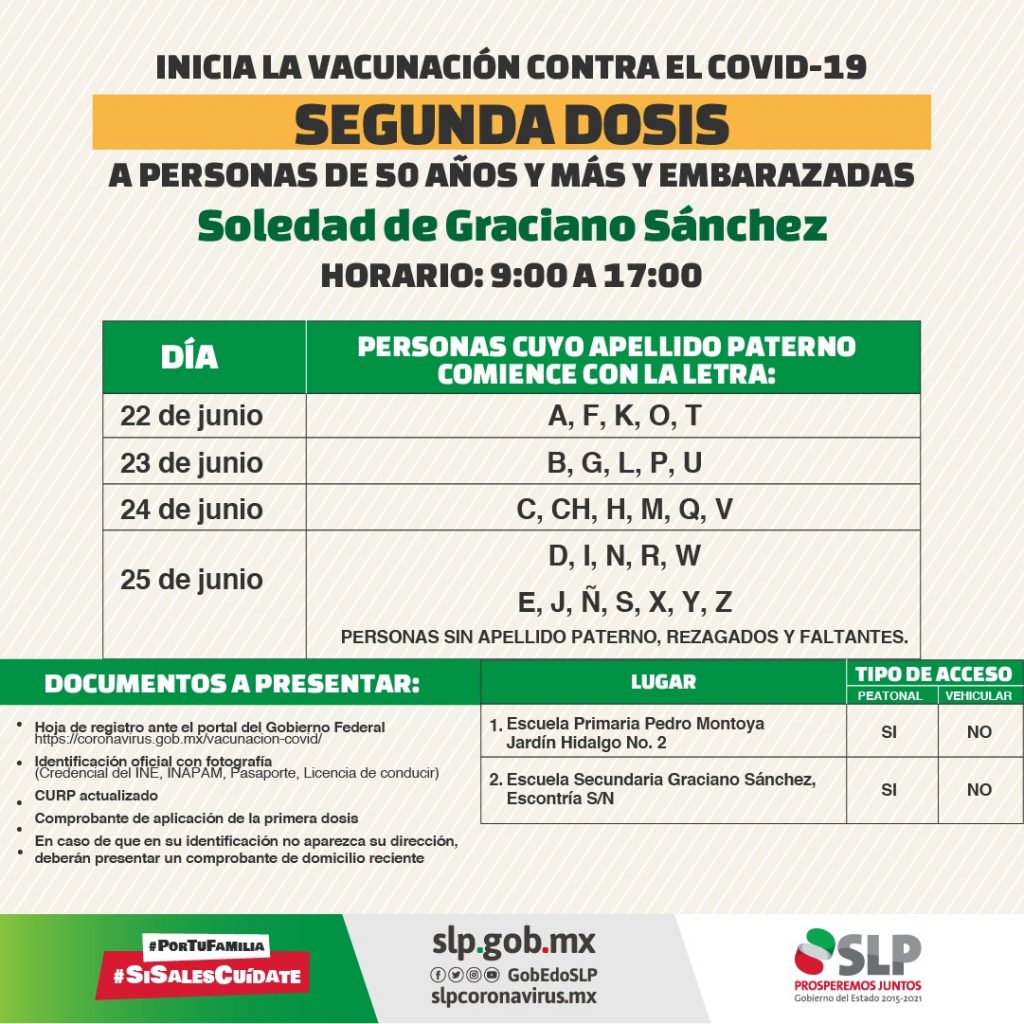 El Gobierno del Estado, invita a la población de 50 a 59 años y mujeres embarazadas mayores a 18 años, habitantes de la capital potosina y Soledad de Gracianos Sánchez, a continuar con el proceso de inmunización contra Covid-19, con la segunda dosis que se aplicará a partir del día de mañana, martes 22 de junio y hasta el viernes 25.