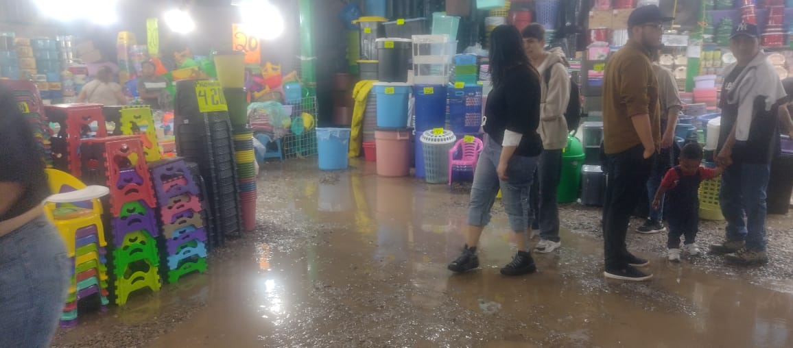 Un puesto de venta de alimentos de la marca Mccormick, ubicado en la parte baja del pasillo central se presenta como un tapón a las corrientes de agua que desfogan en en la antigua Presita, y representa un riesgo, porque también se encuentra a un lado de acceso al Teatro del Pueblo. Ayer trabajadores de este puesto, sacaban agua con escobas por lo inundado del lugar.