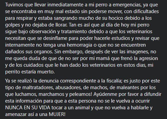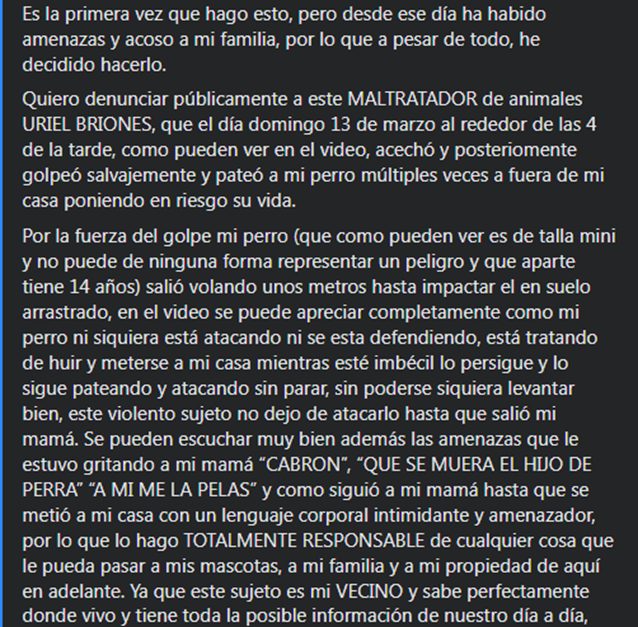 La publicación la realizó el dueño del animal maltratado en facebook, con el objetivo de hacer la denuncia pública, donde se explica la versión desde el conocimiento del dueño y su madre que estuvo presente en la agresión y aunque la publicación original fue eliminada, inmediatamente miles de personas comenzaron a difundirlo