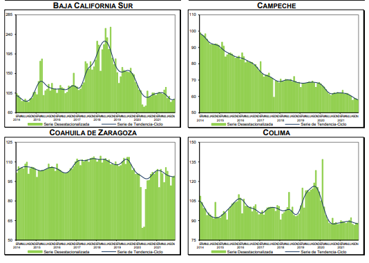 A tasa anual, en noviembre de 2021 y con series desestacionalizadas, las entidades que registraron los incrementos más significativos en términos reales en su producción industrial fueron: Tabasco, Hidalgo, Sinaloa, Morelos, Chiapas y Veracruz de Ignacio de la Llave.