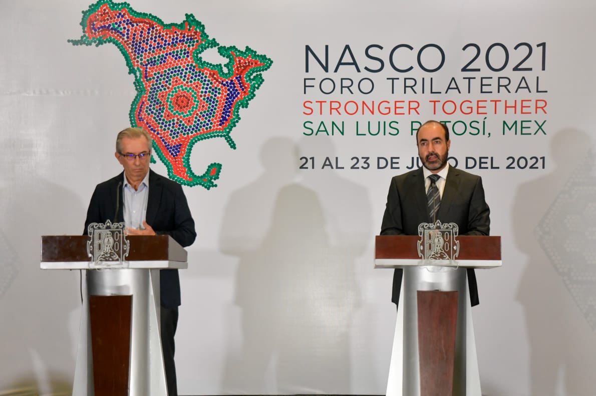 EN RUEDA DE PRENSA, ENCABEZADA POR EL SECRETARIO DE DESARROLLO ECONÓMICO, GUSTAVO PUENTE OROZCO, MICHELE PORRINO, DIRECTOR EJECUTIVO DEL PARQUE INDUSTRIAL WORLD TRADE CENTER, Y A TRAVÉS DE UN ENLACE VÍA ZOOM, TIFFANY MELVIN PRESIDENTA DE NORTH AMERICAN STRATEGY FOR COMPETITIVENESS (NASCO), SE DIO A CONOCER EL FORO TRILATERAL “STRONGER TOGETHER” A REALIZARSE EN SAN LUIS POTOSÍ, DEL 21 AL 23 DE JULIO DEL PRESENTE AÑO.