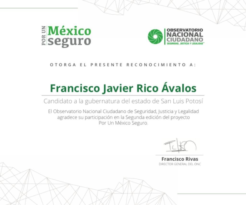 San Luis Potosí, S.L.P.- El candidato Francisco Javier Rico Ávalos presentó su reconocimiento que le otorgó el Observatorio Nacional Ciudadano de Seguridad, Justicia y Legalidad por su participación en la segunda edición del proyecto Por un México Seguro, otorgado por el Lic. Francisco Rivas, director del Observatorio. Un rasgo importante es que el profesor Rico fue el único candidato a una gubernatura que presentó sus propuestas en el rubro de seguridad.