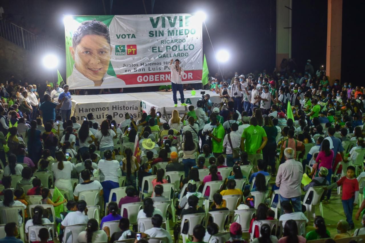 “El Pollo Gallardo dijo que desde hace varios sexenios, los gobernadores se cansan a mitad del sexenio y dejan de gobernar, solo se concentran en mantener el poder, por lo que pidió el voto útil a la ciudadanía para instaurar un gobierno disciplinado, eficiente y con la fuerza necesaria para ejercer un Buen Gobierno en las cuatro regiones de la entidad.