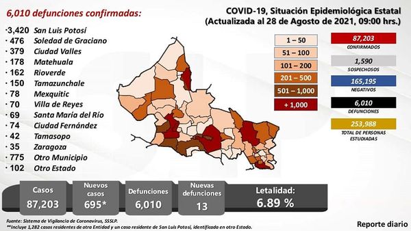 En el reporte técnico de este domingo, se reporta que 695 personas contrajeron COVID-19, para un total de 87 mil 203 confirmados, así como 13 defunciones para un acumulado de 6 mil 010 fallecimientos a causa de esta enfermedad, con una tasa de letalidad de 6.89 por ciento; descartadas 165 mil 195 casos y permanecen en estudio 1 mil 590.