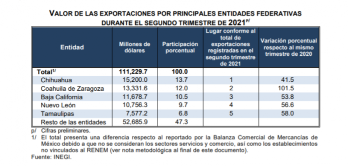 En el segundo trimestre de 2021, los estados que más contribuyeron al valor total de las exportaciones de las entidades federativas fueron Chihuahua con el 13.7%, Coahuila de Zaragoza 12%, Baja California 10.5%, Nuevo León 9.7% y Tamaulipas con 6.8%; en conjunto estos cinco estados aportan el 52.7 por ciento.