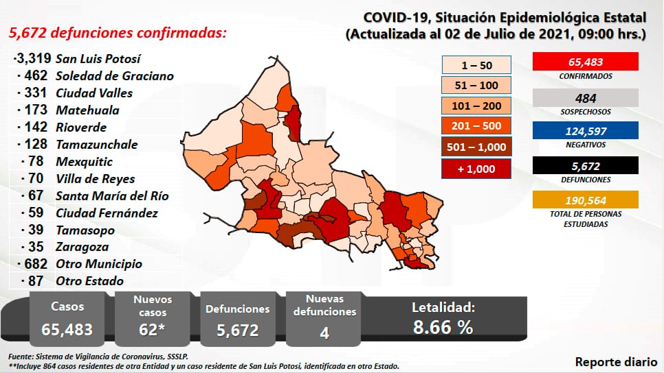 San Luis Potosí capital confirma 37 contagios, seguido por Soledad de Graciano Sánchez con 5, 2 en Matehuala, 1 en Charcas, 1 en Rioverde, 5 en Ciudad Valles, 5 en Ébano, 1 en Tamuín, 1 en El Naranjo, 2 en Tamazunchale, 1 en Aquismón y un caso más proveniente de otro estado. Son 30 mujeres y 32 hombres en un rango de edad de los 14 a 87 años.