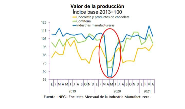 Debido al impacto de la crisis sanitaria por la Covid-19, en el chocolate y productos de chocolate, en la confitería y en las industrias manufactureras se observan severas caídas del valor de la producción en abril y mayo de 2020, y después de esos meses se presenta una recuperación. En particular, para el chocolate y productos de chocolate la caída fue menor a la que presentó la confitería.