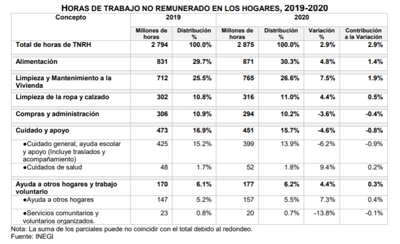 El Instituto Nacional de Estadística y Geografía (INEGI) presenta los resultados de la Cuenta Satélite del Trabajo No Remunerado de los Hogares de México (CSTNRHM) 2020, con el objetivo de proveer información acerca del valor económico de las horas de trabajo no remunerado que los miembros del hogar destinan a las labores domésticas y de cuidados.
