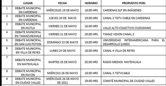 El Consejero explicó que luego de conciliar el calendario de fechas para la celebración de los debates solicitados con los Comités Municipales Electorales y a fin de evitar la simultaneidad de su realización y con el fin de tener una mejor planeación, las fechas definitivas de los debates son las siguientes: