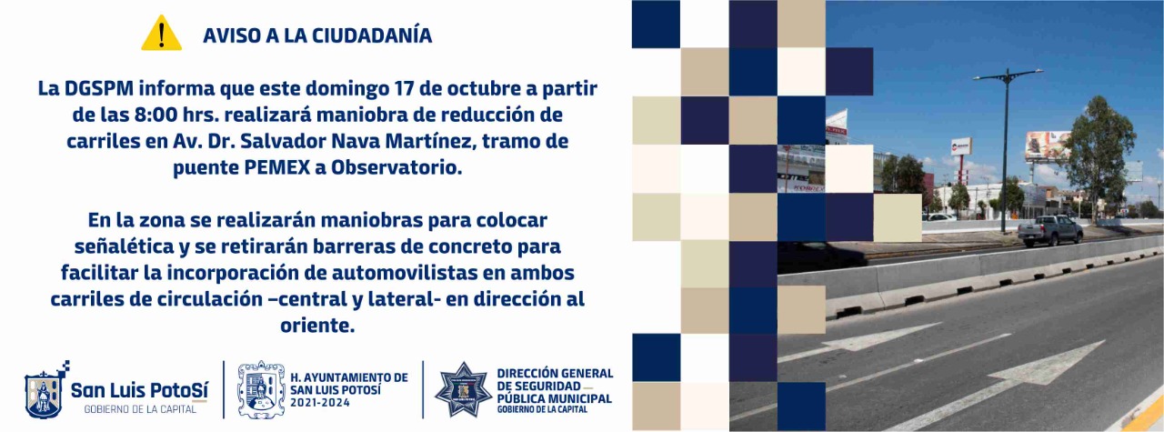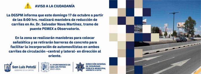 La maniobra de retiro de las barreras de concreto e instalación de señalética en dicho tramo de la avenida Salvador Nava Martínez, se realizará a partir de las 8:00 horas -con duración estimada de dos horas- de este domingo 17 de octubre, por lo que la DGSPM informa a la ciudadanía que se realizará un dispositivo de seguridad con elementos de Policía Vial que estarán atentos para prevenir cualquier maniobra que pueda generar accidentes.
