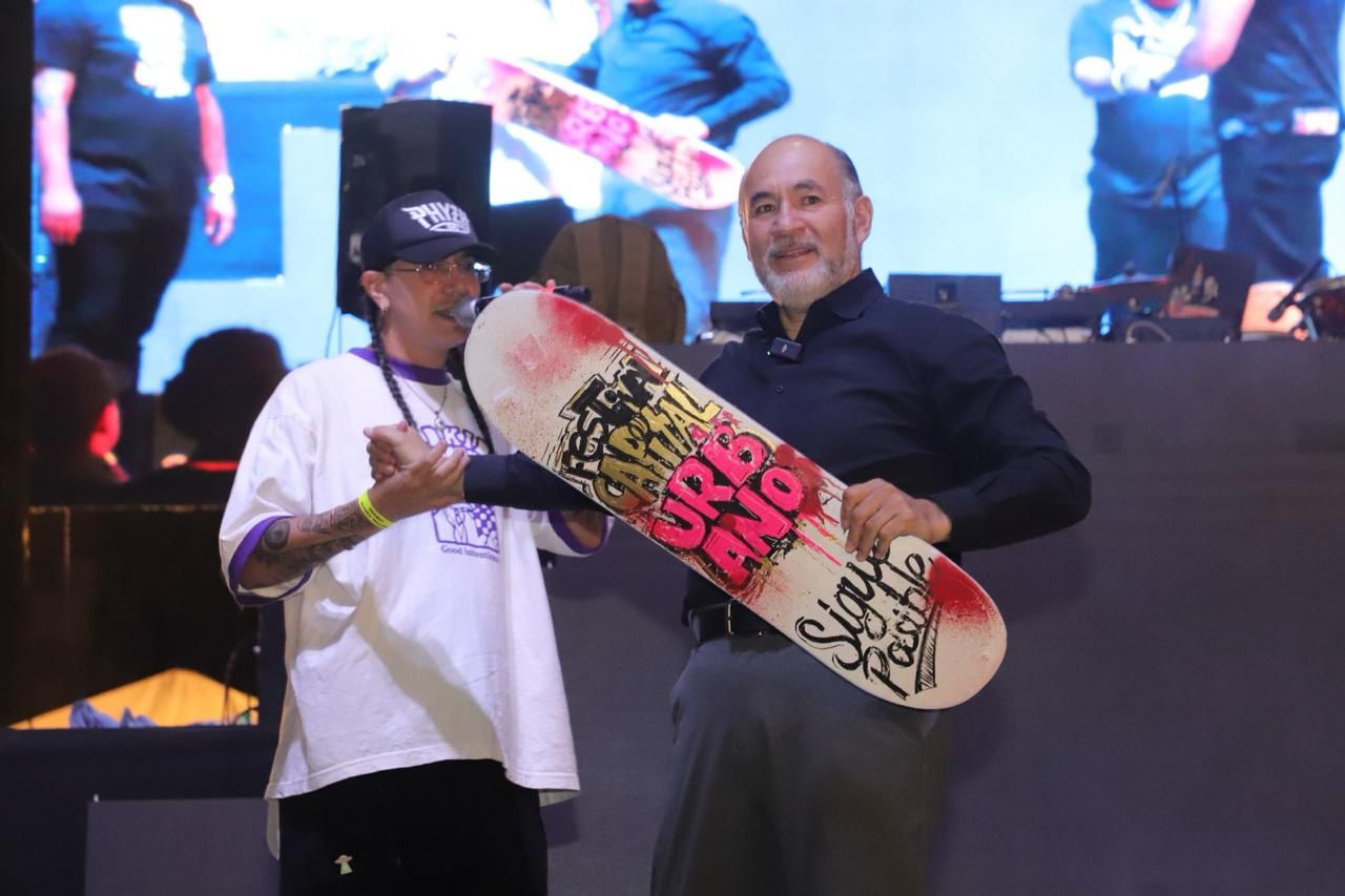 El Alcalde Enrique Galindo entregó un reconocimiento a La Banda Bastón por su participación en este evento, con el que el Ayuntamiento de la Capital celebra la creatividad y destrezas de jóvenes talentosos en disciplinas como skate, BMX, parkour, graffiti, rap y break dance. En respuesta, los integrantes de La Banda Bastön regalaron al Alcalde Galindo una patineta, como símbolo de las acciones del Ayuntamiento para dar alternativas de esparcimiento equitativas para la ciudadanía de la Capital