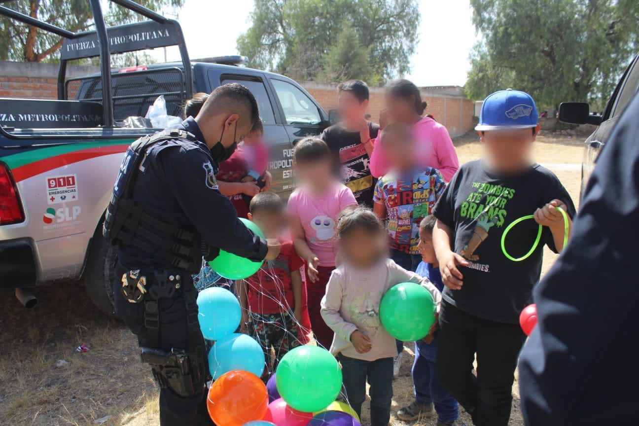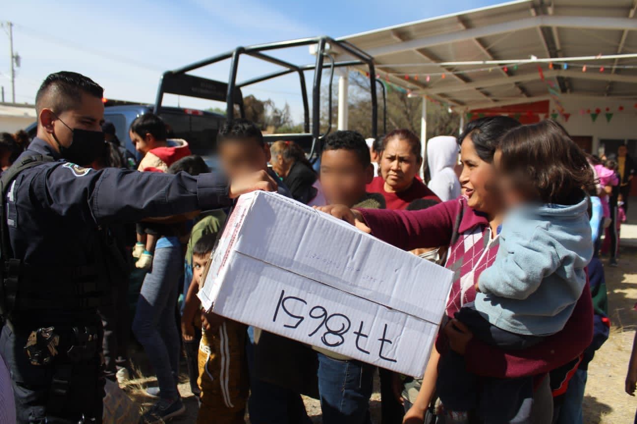 Los elementos de seguridad acudieron a las comunidades de Carranco y San Lorenzo en Villa de Reyes en donde se entrevistaron con madres de familia quienes acudieron con sus hijas e hijos y recibieron a los Estatales con emoción mientras esperaban sus regalos.