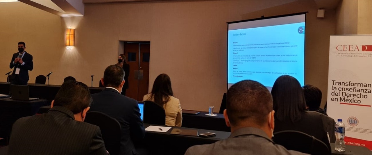 Durante la reunión se presentaron algunos avances sobre la certificación para la Justicia en México por parte del Centro de Estudios sobre la Enseñanza y el Aprendizaje del Derecho, A.C. (CEEAD) para así contribuir a la consolidación del sistema de justicia penal, a través del fortalecimiento de los procesos de formación y profesionalización de las y los operadores del sistema.