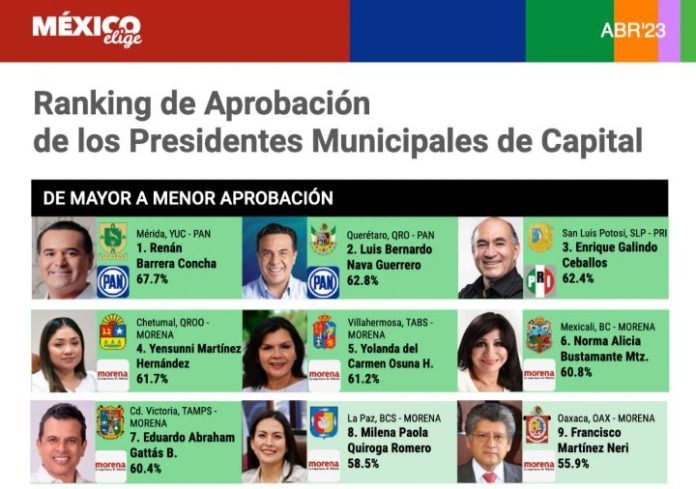Los resultados que presentó México Elige colocan en primer lugar al Presidente Municipal de Mérida, Yucatán, Renán Barrera Concha, con 67.7 puntos porcentuales; mientras que en segundo lugar aparece Luis Bernardo Nava, de Querétaro, con 62.8 por ciento de aprobación.