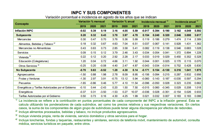 El Instituto Nacional de Estadística y Geografía (INEGI) informa que en agosto de 2021 el Índice Nacional de Precios al Consumidor (INPC) registró un crecimiento de 0.19 por ciento respecto al mes inmediato anterior. Con este resultado la inflación general anual se estableció en 5.59 por ciento. En el mismo mes de 2020 las variaciones fueron al alza, de 0.39 por ciento mensual y de 4.05 por ciento anual.
