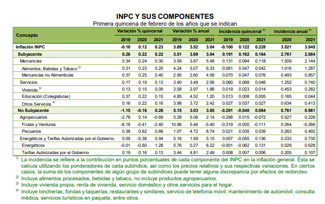 El Instituto Nacional de Estadística y Geografía (INEGI) informa que en la primera quincena de febrero de 2021 el Índice Nacional de Precios al Consumidor (INPC) registró una inflación quincenal de 0.23 por ciento, así como una inflación anual de 3.84 por ciento. En el mismo periodo de 2020 las variaciones fueron de 0.12 por ciento quincenal y de 3.52 por ciento anual.