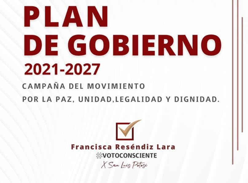La Candidata Legítima a la Gubernatura, Francisca Reséndiz Lara presentó los principales ejes rectores del Plan de Gobierno del Movimiento por la Paz, la Unidad, la Legalidad y la Dignidad, que impulsan una propuesta alterna de modelo de desarrollo integral para la población de San Luis Potosí, ante la carencia de propuestas viables y realistas, por parte de quienes ocupan las candidaturas de partidos y coaliciones al poder ejecutivo estatal, que se han limitado a repetir los mismos lugares comunes en las promesas de campaña.