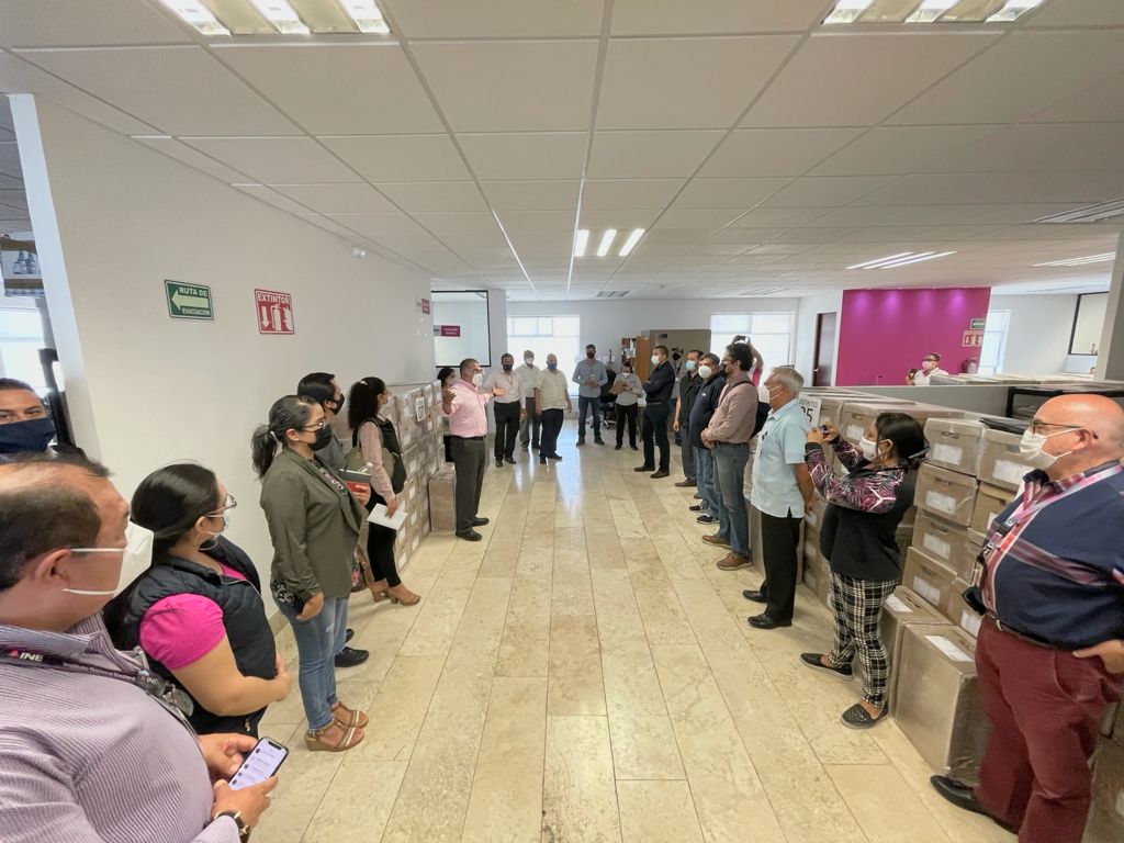 A partir de las 14:00 se efectuó la distribución entre las y los vocales ejecutivos de las siete juntas distritales para continuar con la distribución hasta llegar a las y los funcionarios directivos de casilla que recibirán a sus vecinos el próximo 6 de junio.