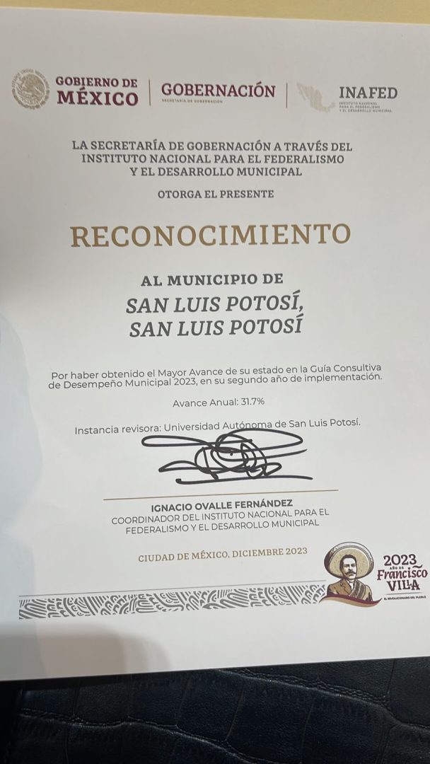 El Ayuntamiento de San Luis Potosí recibió del Gobierno Federal el reconocimiento por haber sido el municipio que mayor avance anual presentó en la implementación de la Guía Consultiva de Desempeño Municipal 2023 en todo el estado.