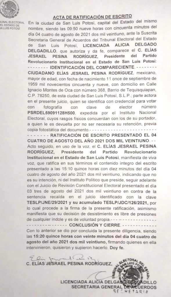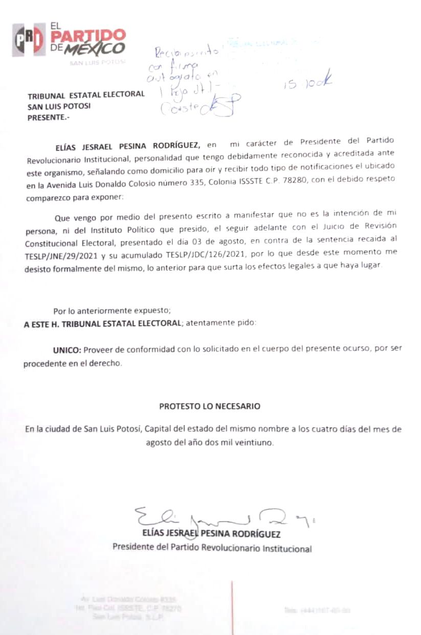 “No es la intención de mi persona, ni del instituto político que presido, el seguir adelante con el Juicio de Revisión Constitucional Electoral, presentado el día 03 de agosto, en contra de la sentencia recaída al TESLP/JNE/29/2021 y su acumulado TESLP/JDC/126/2021, por lo que desde este momento me desisto formalmente del mismo, lo anterior para que surta los efectos legales a que haya lugar”, dice el documento enviado por el dirigente priista.