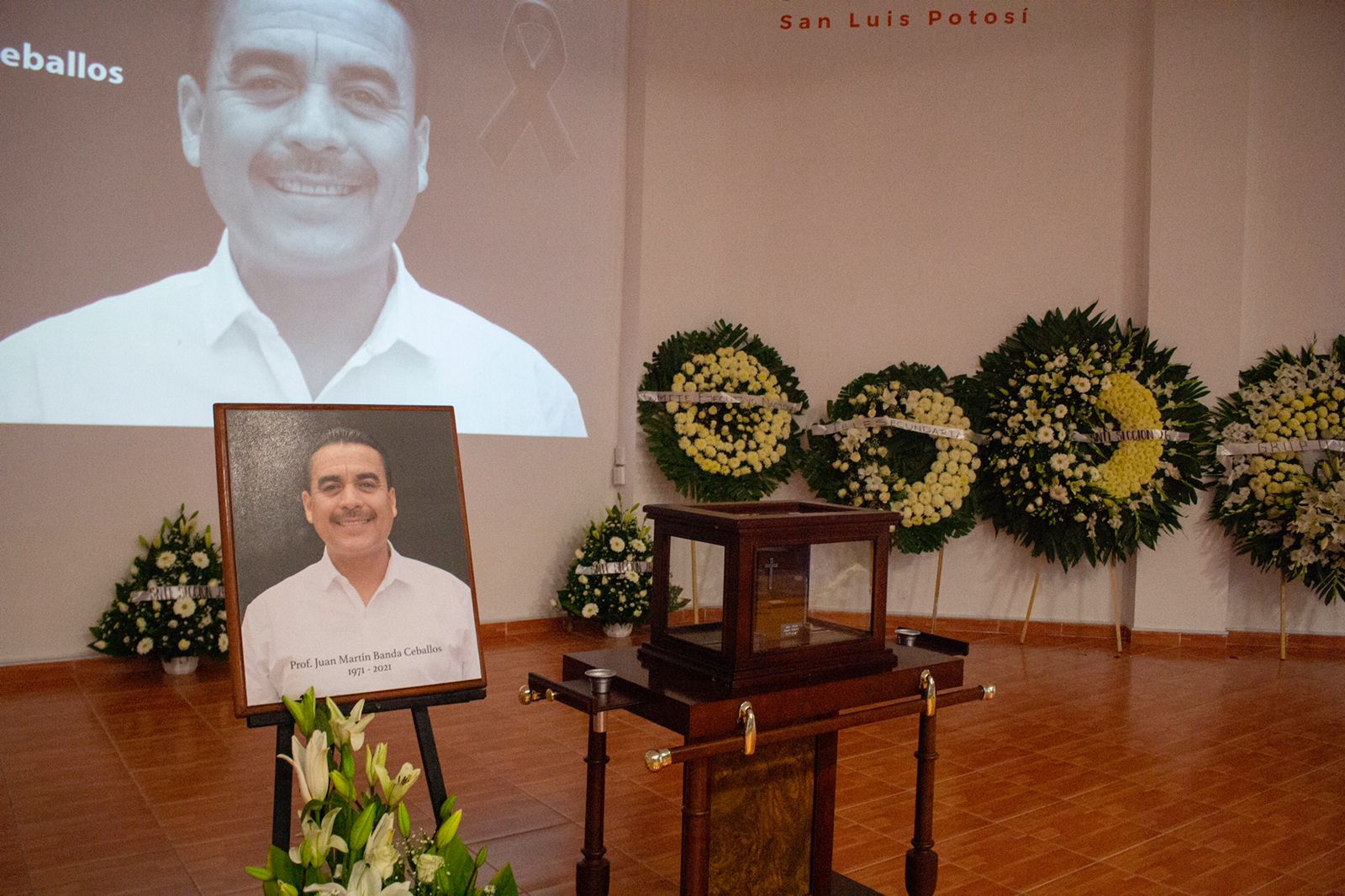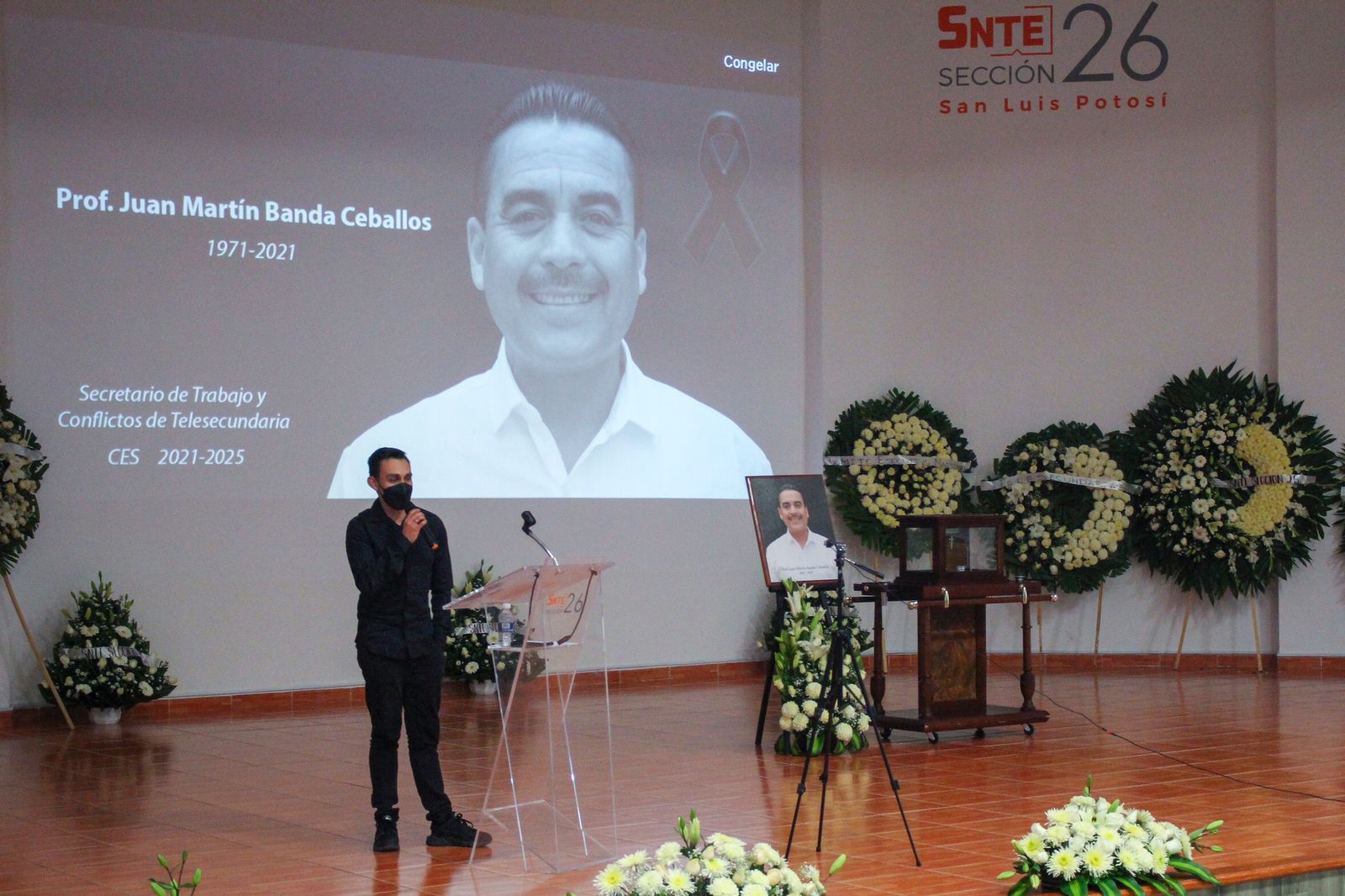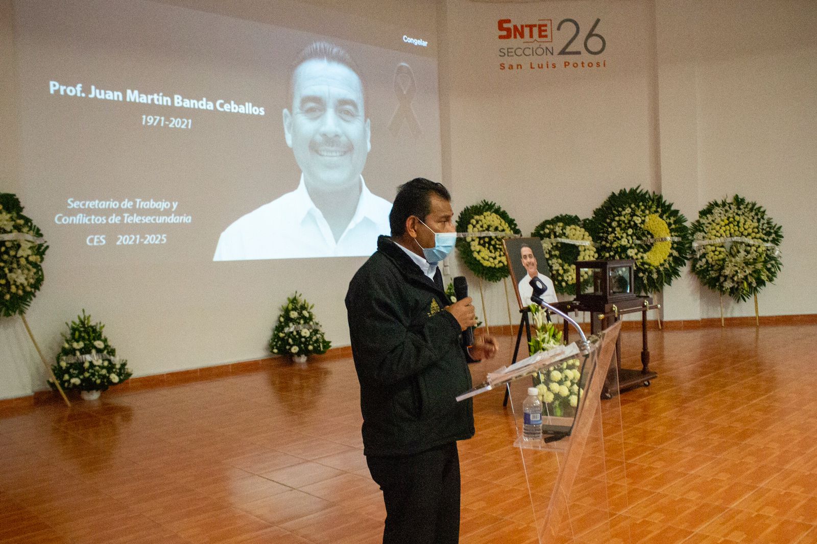 Por su parte el Prof. José de Jesús Serrano Aguilera Representante del Comité Ejecutivo Nacional para la Sección 26 del SNTE dio las condolencias a nombre del Mtro. Alfonso Cepeda Salas Secretario General del CEN del SNTE, el compañero Martín Banda nos deja una ausencia dolorosa, que lastima a toda la familia sindical, en el SNTE somos un colectivo de influencia social, un sindicato de valores, por naturaleza somos fraternos y solidarios en nuestra profesión, hoy nos convoca un acontecimiento triste, que nos duele y nos consterna, uno de los nuestros se nos adelantó, dejando su ejemplo y su vocación de servicio a sus alumnos y el amor a toda su familia.