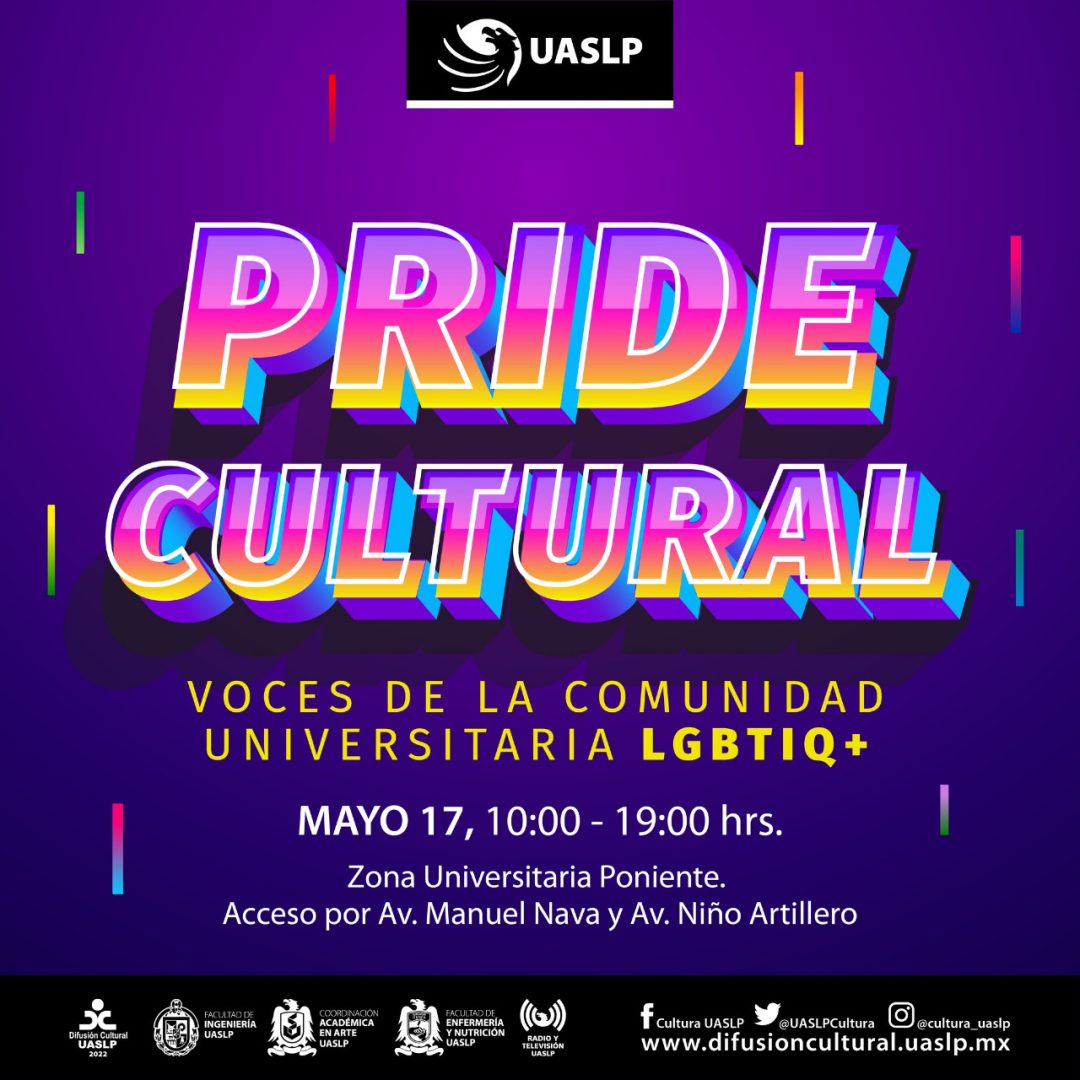 La Secretaría de Difusión Cultural a través del Departamento de Arte y Cultura de la UASLP, en colaboración con el Colectivo UASLP + invitan al primer Primer Pride Cultural “Voces de la comunidad universitaria LGBTIQ+”, el próximo 17 de mayo 2022 a partir de las 10:00 horas en la Zona Universitaria Poniente, con entrada libre.