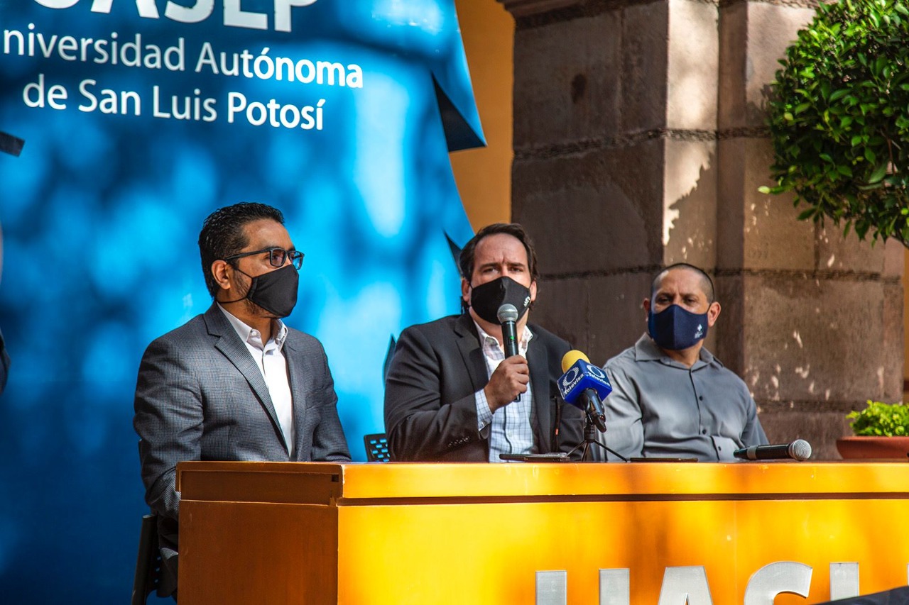 En rueda de prensa, los doctores Sergio Rosales Mendoza, Mauricio Comas García y Omar González Ortega, dieron a conocer los avances de la vacuna contra el Covid, que está desarrollando la Universidad Autónoma de San Luis Potosí.
