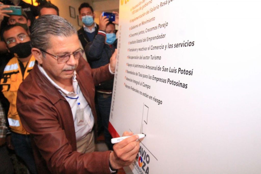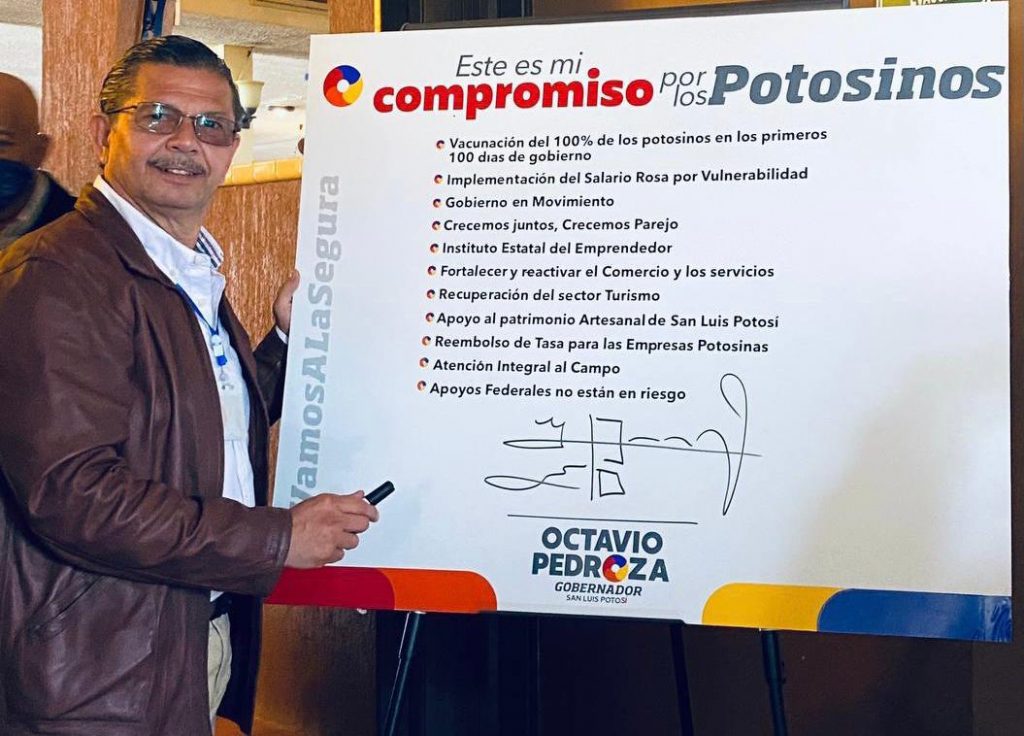 Matehuala, S.L.P.- El candidato a la gubernatura por la Coalición «Sí por San Luis Potosí, Octavio Pedroza Gaitán, firmó una serie de compromisos para impulsar el desarrollo económico de las cuatro regiones del Estado, entre los que destaca la vacunación contra el Covid-19 al 100% de la población potosina para la reactivación económica en cada uno de los sectores productivos de la entidad potosina.