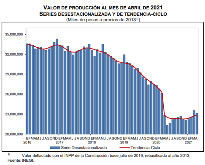 En su comparación anual, el valor real de la producción de las empresas constructoras mostró un alza de 1.2%, el personal ocupado total de 4.2%, las horas trabajadas crecieron 12.8% y las remuneraciones medias reales 0.9%, en abril del presente año frente a igual mes de 2020.