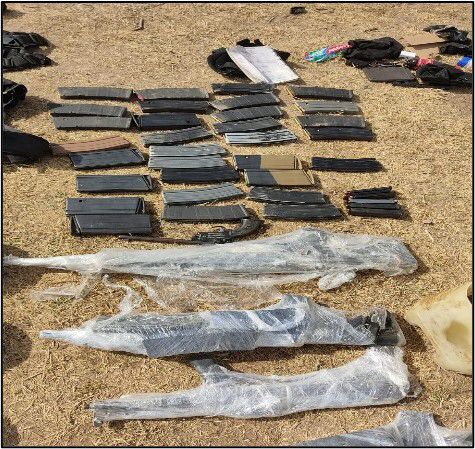 denuncia ciudadana, sobre la presencia de personas armadas en la comunidad Las Cabras, municipio de Pinos, Zacatecas, al arribar a la ubicación fueron agredidos con disparos de armas de fuego por varios individuos que se encontraban en el exterior de un predio abandonado, por lo que al repeler la agresión se logró la detención de 22 personas; a quienes se les aseguró lo siguiente: