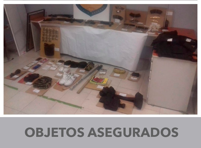 En este hecho se logró el aseguramiento de 3 armas largas, 207 cartuchos útiles, 9 cargadores para AK-47, un chaleco antibalas, dos placas, 3 fornituras para cargadores, un portafusil, cuatro libretas, un paquete de bolsas transparentes, dos pipas hechizas, tres tramos de mangueras, tres paquetes con etiquetas adheribles con la leyenda de un grupo delictivo, un bat metálico, un pasamontañas, una lampara, una báscula gramera, dos cachuchas, vendas blancas, cuatro celulares y 23 bolsas de nylon transparente con hierba verde seca con las características de la marihuana.