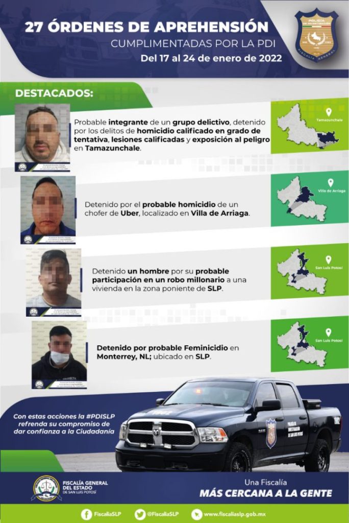 Del 17 al 24 de enero del 2022, la Fiscalía General del Estado (FGE) hizo efectivas 27 órdenes de aprehensión a igual número de personas por diversos delitos en todo San Luis Potosí, informó Arturo Rodríguez García, Comisario Encargado de Despacho de la Policía de Investigación (PDI).