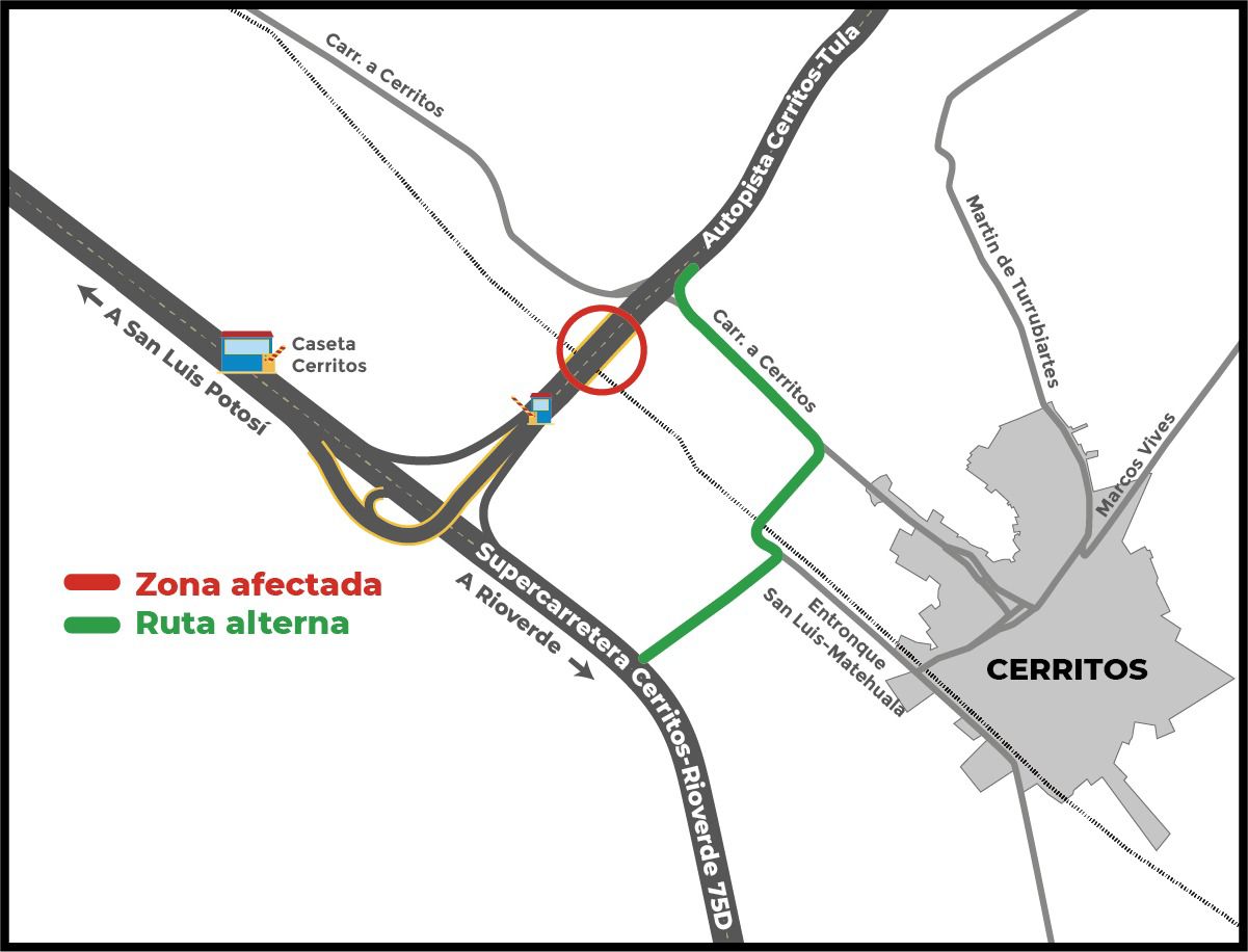 Gutiérrez Juárez puntualizó que la circulación en la carretera Cerritos-Tula quedó habilitada desde el primer día que se presentó el daño, mediante una ruta alterna que desvía el tráfico por un libramiento que incorpora a la carretera sin pasar por la zona afectada, y que toma un tiempo estimado de 5 a 7 minutos.}