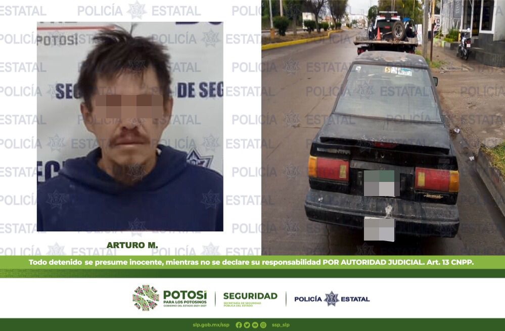 Finalmente en el municipio de Rioverde fue detenido sobre el Boulevard Carlos Jonguitud Barrios y Boulevard Ferrocarrilero, perteneciente a la colonia La Morita, Arturo M., de 38 años de edad, por presuntamente conducir un vehículo Nissan, tipo Sentra, modelo 1988, con placas sobrepuestas, del estado de Texas.